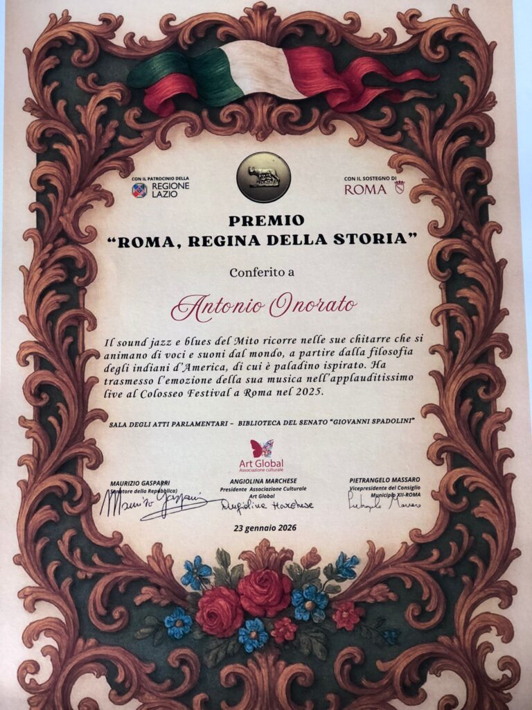Nella cornice della Sala degli Atti Parlamentari della Biblioteca del Senato “Giovanni Spadolini”, lo scorso 23 gennaio 2026 Antonio Onorato è stato insignito del prestigioso Premio “Roma, Regina della Storia”, promosso dall’Associazione culturale Art Global con il patrocinio della Regione Lazio e il sostegno di Roma Capitale.